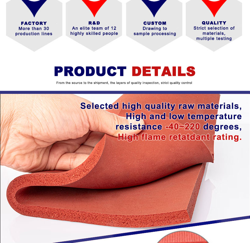 矽橡膠發泡片材是一種具有優異的抗壓縮和永久變形性能的有機矽發泡材料。矽橡膠發泡片材具有耐高低溫(-55-220℃)、高阻燃(V-0)極低煙霧濃度等特點。工藝:壓制高溫一體成型。服務:切割、加LOGO、打孔、可背雙面膠等物理性能:環保、阻燃、耐高溫等。